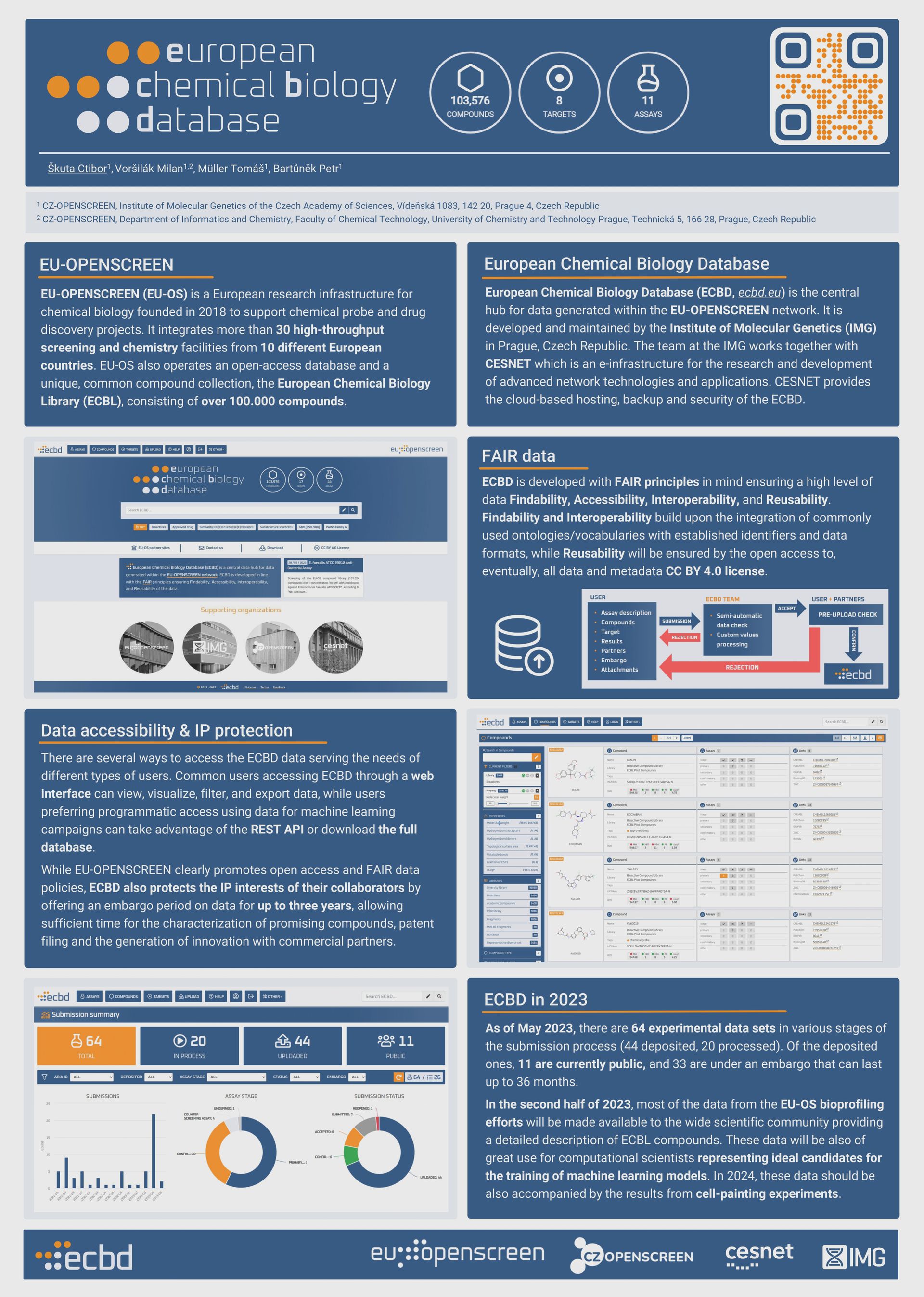 We will present one talk and two posters at the conference. The talk with the title Identification of novel inducers of erythropoiesis by high-content screening will be presented by Petr Bartůněk, the director of CZ-OS, on Thursday afternoon, as a part of the Innovative tools and methods for advanced cell profiling section. Concerning the posters, the first one was created by Martin Popr, the head of the compound management and automation at CZ-OS, and describes our AUTOMATED COMPOUND MANAGEMENT PIPELINE AT THE CZ-OPENSCREEN; the second one, by Ctibor Škuta, the head of the cheminformatics and software development, presents the European Chemical Biology Database (ECBD, ecbd.eu), developed and managed by CZ-OS, and its state in 2023.